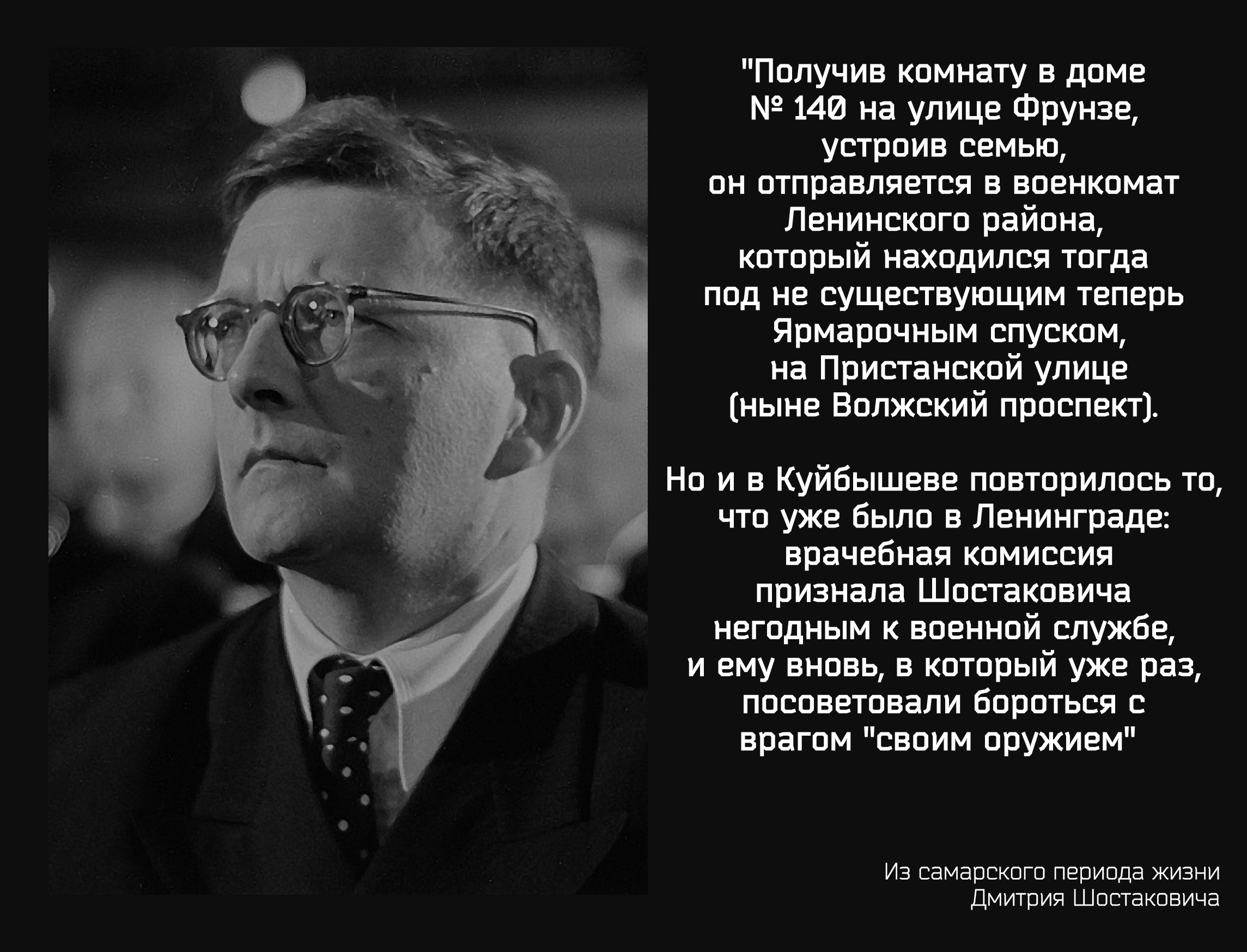 Шостакович с семьей прибывают в Самару. После неудавшейся попытки уйти на фронт добровольцем композитор начинает работу. Музыкант возглавляет отделение Союза композиторов, активно участвует в культурной жизни города, садится за партитуру. Именно здесь, в своей квартирке на улице Фрунзе, Дмитрий Дмитриевич поставил точку в работе над седьмой «Ленинградской» симфонией.