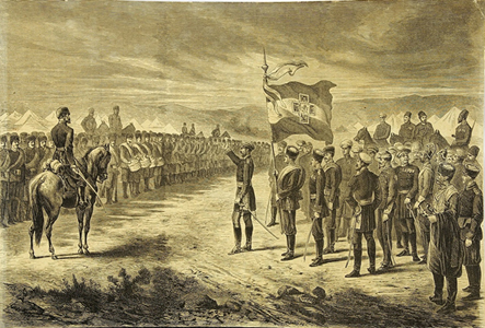 Когда Алабин был городской головой, на его долю выпала четвёртая война — русско-турецкая. Пётр Владимирович отправил туда двух своих сыновей. Они выступали против турок в 1876 году в Сербии. Война очень быстро закончилась, его сыновья вернулись живыми и здоровыми, и Алабин сделал для них то самое знаменитое самарское знамя. Его основой являлся как раз старо-хорватский флаг тех времён.