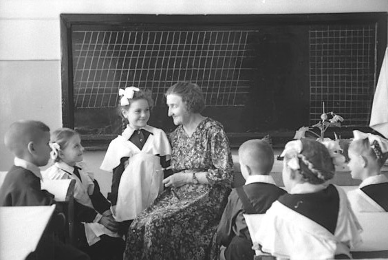 Учительница 1 класса З.В. Подбельская знакомится со своими учениками. 1956 г. Из фотофонда ЦГАСО