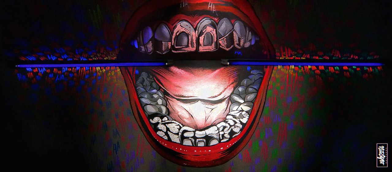 Однажды я рисовала улыбку Джокера в заведении у друзей. Расположила рисунок в углу между стеной и потолком, чтобы создать эффект 3D-фотозоны (если фотографировать чуть снизу, рот как будто съедает вас). Губы и язык нарисовала глянцевым акрилом, контур рисунка — масляными маркерами, зубы — белой флуоресцентной краской (на передних зубах Джокер носит серебряные гриллзы, их я нанесла серебряной поталью), а вокруг рта я сделала много разноцветных флуоресцентных надписей «НА-НА» и всё это подсветила ультрафиолетом.