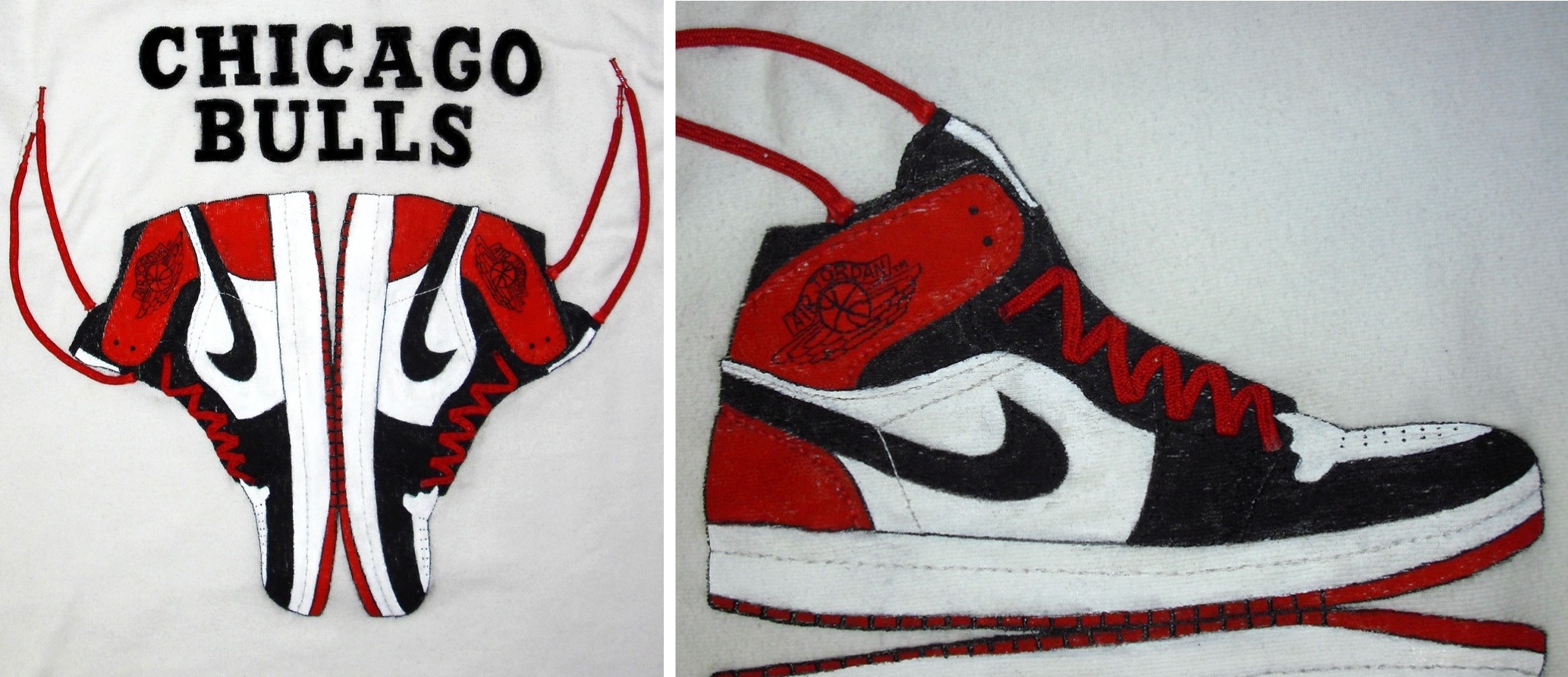 Много лет назад я фанатела от команды Chicago Bulls и мечтала иметь футболку с их логотипом, но мама не поддержала мой интерес. Поэтому я взяла свою старую майку и подобрала эскиз с кроссовками Nike Air Jordan, выложенными в форме головы быка с рогами. Ювелирно прорисовать эмблемы на кроссовках показалось для меня недостаточно сложной задачей, поэтому я решила пройтись вручную нитками, создав имитацию прошивки как на настоящей обуви. Вдобавок пришила красные шнурки, которые сымитировали силуэты рогов.