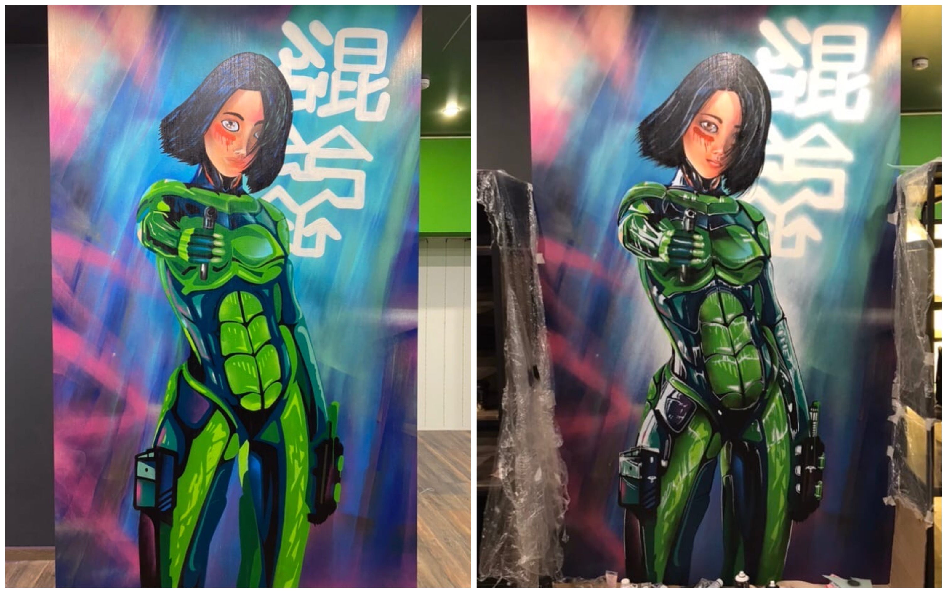 Недавно я столкнулась с нетипичной для себя задачей — дорисовать и оживить работу другого художника. Это был трёхметровый в высоту рисунок на стене с изображением девушки-киборга Алиты. Основа была заложена хорошая, но для полного восторга заказчика не хватало бликов и объема. Так как портреты — это мой конёк, я полностью перерисовала черты лица, добавила эффект свечения на фон и неоновые буквы, проработала светотени, и картинка заиграла. У меня не было цели как-то осквернить труд другого художника и уж тем более приписывать этот проект полностью себе. Я считаю, что получился крутой творческий тандем, и именно наш общий вклад помог сделать еще несколько людей счастливыми.