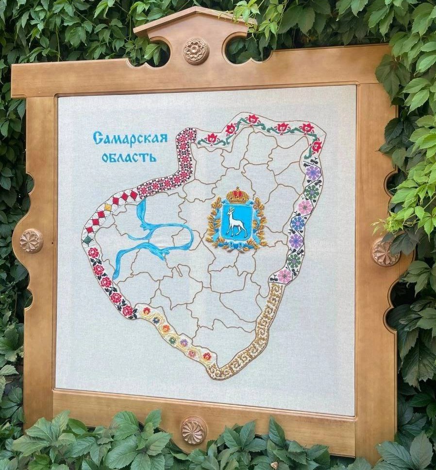 Необычная карта Самарской области стала украшением всероссийского фестиваля «Вышитая Россия», прошедшего в Чебоксарах с 18 по 21 августа. Самарские мастерицы представили расшитое панно размером примерно метр на метр в деревянной раме, стилизованной под оконный наличник самарской домовой резьбы.