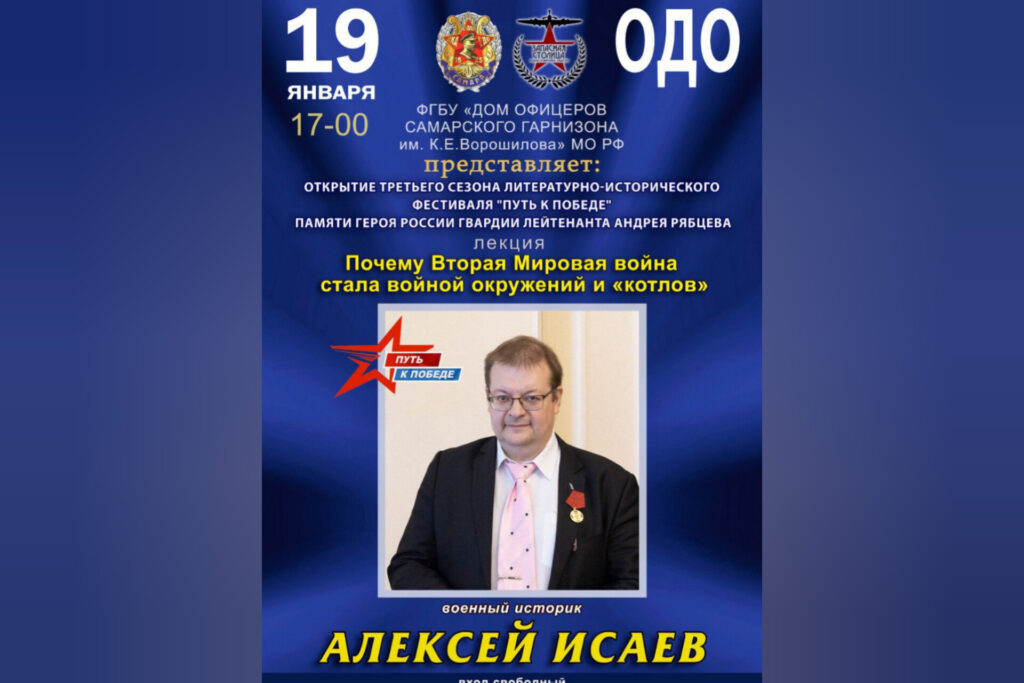 В большом зале самарского Дома офицеров 19 января в 17:00 пройдет лекция кандидата исторических наук Алексея Исаева по теме «Почему Вторая Мировая война стала войной окружений и «котлов». Об этом сообщили в региональном правительстве.