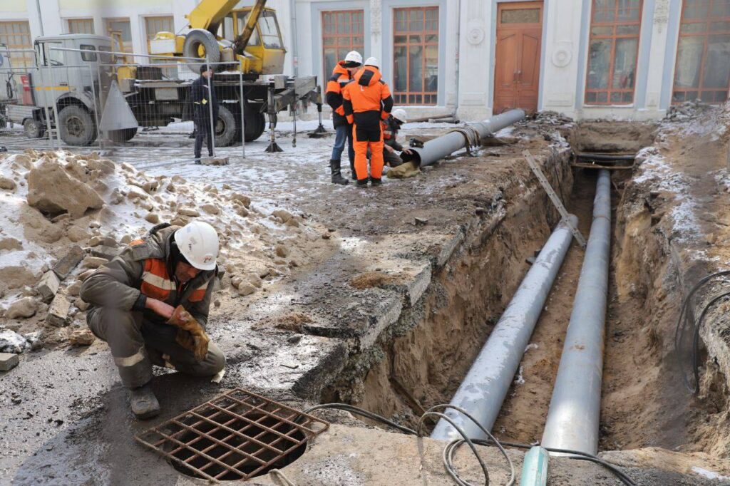 На аварийном участке демонтировали рельсошпальную решетку трамвайных путей, провели земляные работы, удалили фрагмент старого трубопровода диаметром 100 мм, на котором обнаружили дефект. Сейчас там завершают монтаж нового участка стальных труб. Заменили свыше 40 метров трубопровода, присоединили трубы к тепловой камере.