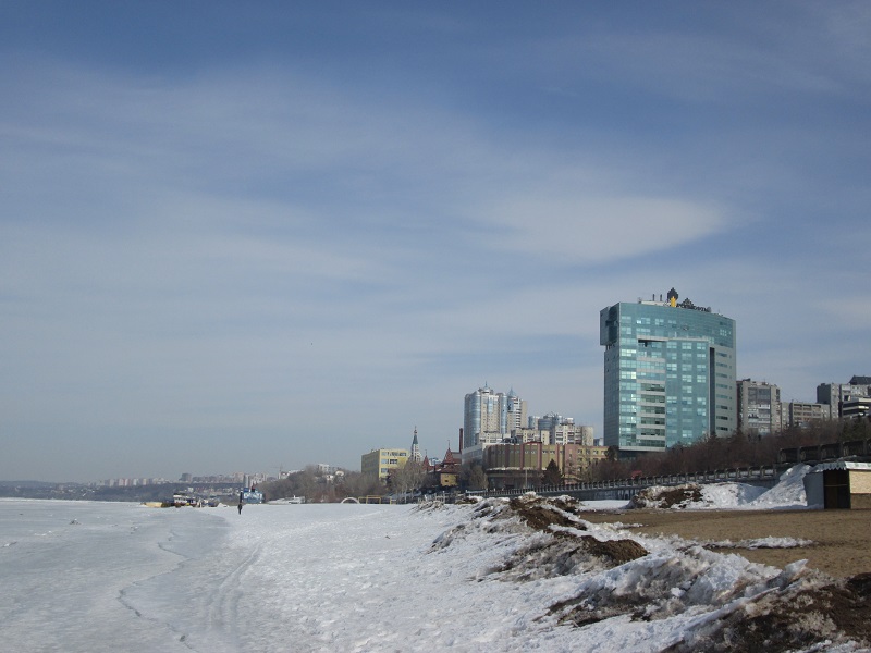 Толщина льда в черте города различается. Самым прочным он оказался в районе улицы Первомайской и Барбошиной поляны – до 25 см около берега. Но на фарватере в районе Барбошиной поляны уже есть промоины. Рядом с ЦСС лед тоньше – на расстоянии 200-300 м от берега его толщина не превышает 12 см, ближе к фарватеру толщина льда составляет 18 см. Самый тонкий лед в городе – на Красной Глинке. Его толщина около берега всего 9 см, а ближе к фарватеру лед становится еще тоньше – не более 7 см.