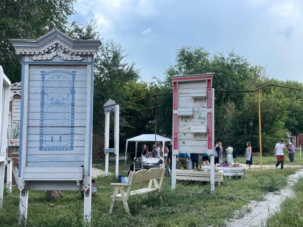 Несколько лет назад на этом месте сгорел дом, после — долгое время был пустырь. В том году тут уже начинали устанавливать наличники и клумбы. Сейчас работы возобновились. Волонтеры фестиваля совместно с сотрудниками ресторанной сети продолжают подготавливать пространство к дальнейшим работам: убрали мусор, бурьян, старые деревья. Скоро приступят к основному обустройству площадки. На территории необходимо установить деревянные настилы, беседки, высадить растения и сделать подсветку.