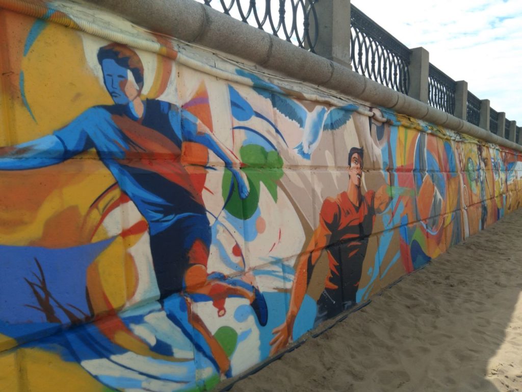 Арт-объект на стене набережной протяженностью 30 метров, в районе Первомайского спуска, посвящен летним видам спорта. Например, это пляжные волейбол, футбол, теннис и фрисби. Всего 11 видов. Граффити нарисовали в преддверии физкультурно-спортивного фестиваля.