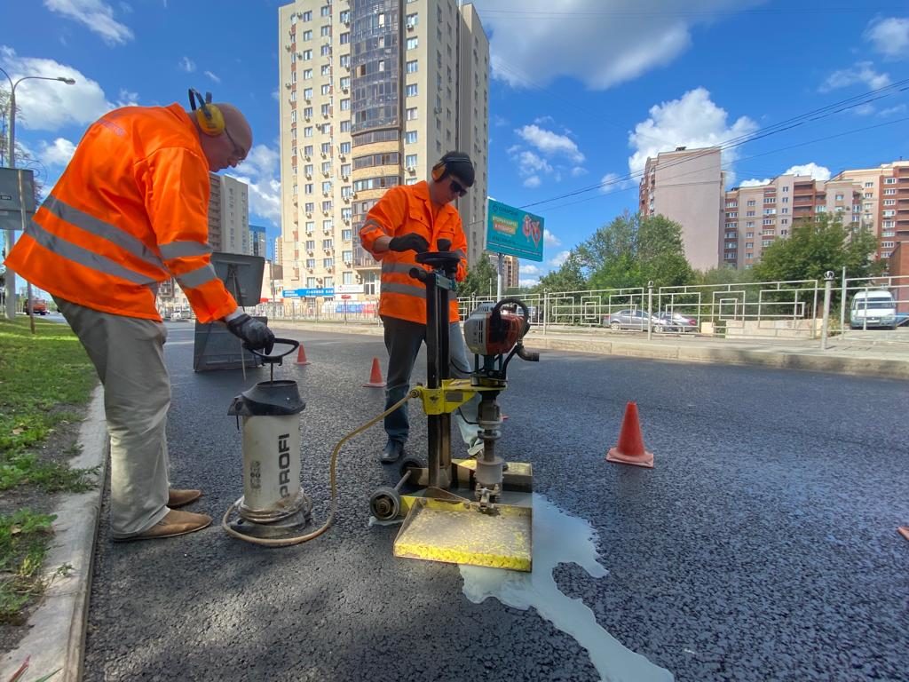 Так, 1 августа в присутствии представителей подрядной организации сотрудниками МБУ Самары «Дорожное хозяйство», в том числе специалистами дорожной лаборатории МБУ, был организован отбор проб нового покрытия проезжей части улицы Солнечной. Ранее на участке, на площади порядка 19 тысяч кв. м, выполнили укладку асфальтобетонной смеси ЩМА-16 на полимерно-битумном вяжущем. Керны допустимо отбирать уже через 1-1,5 суток после устройства нового покрытия. Специалисты также поясняют, что в соответствии с нормативными документами отбор кернов выполняется в количестве не менее одной штуки, но не более трех штук на каждые 3 тысячи кв. м, то есть акцент – на площадь устроенного покрытия (а не на протяженность того или иного участка), а также учитывается ширина покрытия проезжей части.