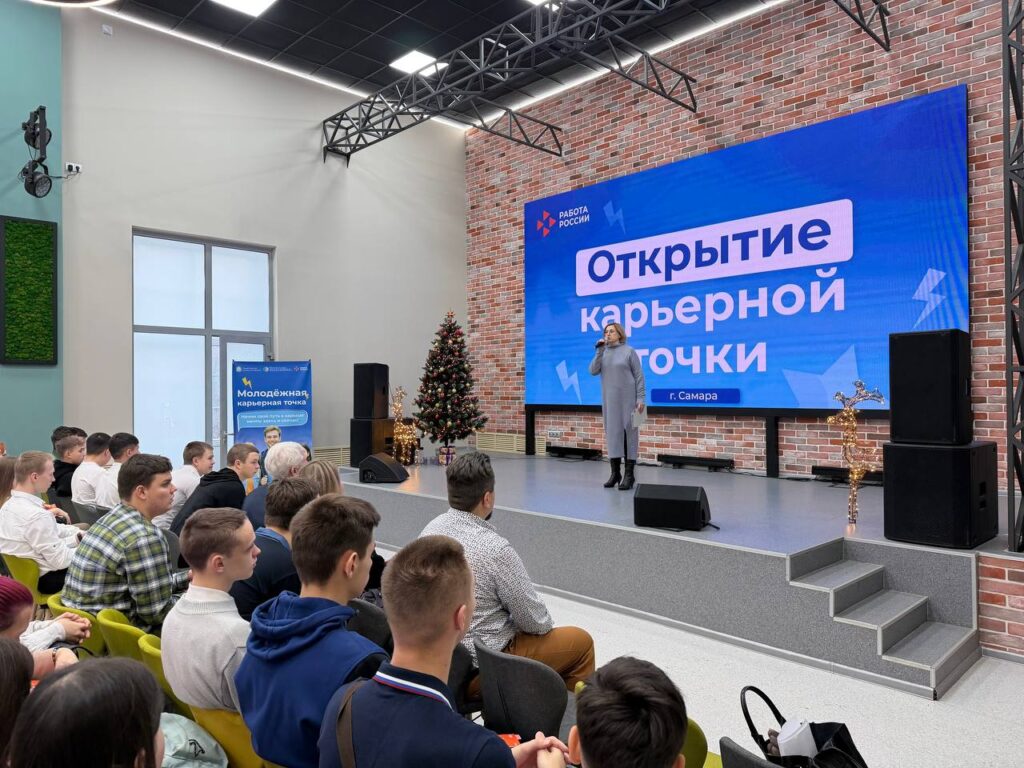 Первая такая точка уже работает в Сызрани. Теперь аналогичный центр открывается по адресу Масленникова, 37 в Самаре. Сегодня школьники и студенты поучаствовали в интерактивных форматах выбора потенциальной работы: поиграли в профлото, прошли карьерный квиз «Назад в будущее» и «Компас профессии».