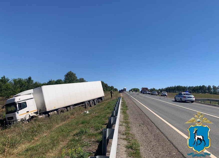 Сотрудники полиции работают на месте ДТП в Похвистневском районе Самарской области. Сегодня, 12 августа, около 11:50 на 144 километре автодороги «Самара-Бугуруслан» произошло ДТП с участием двух автомобилей.