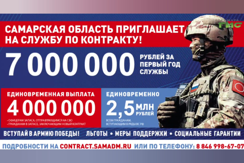 В Самарской области при заключении контракта с Минобороны РФ единовременно выплачивают 4 000 000 руб. офицерам запаса, отправляющимся на СВО, и гражданам в запасе, которые заключают новый контракт. Всего за первый год службы сумма составит 7 000 000 руб. Всем остальным гражданам, вступающим в ряды российской армии, выплатят 2 500 000 руб.