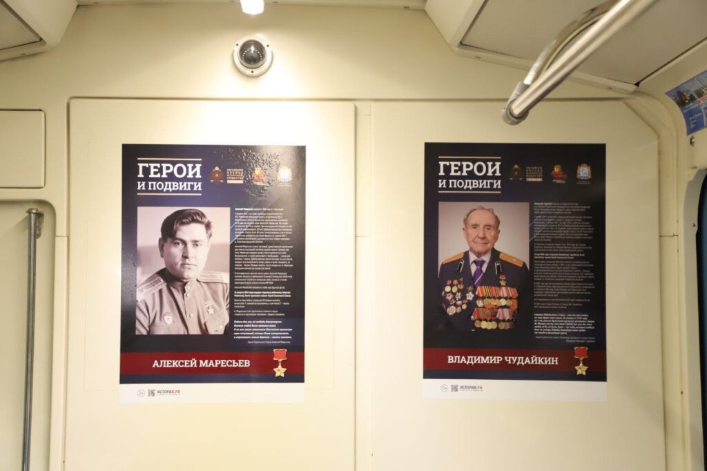 В восьми поездах разместили плакаты об участниках военных событий. Каждая фотография сопровождается биографией бойца. В экспозиции отразили 38 историй солдат и офицеров.