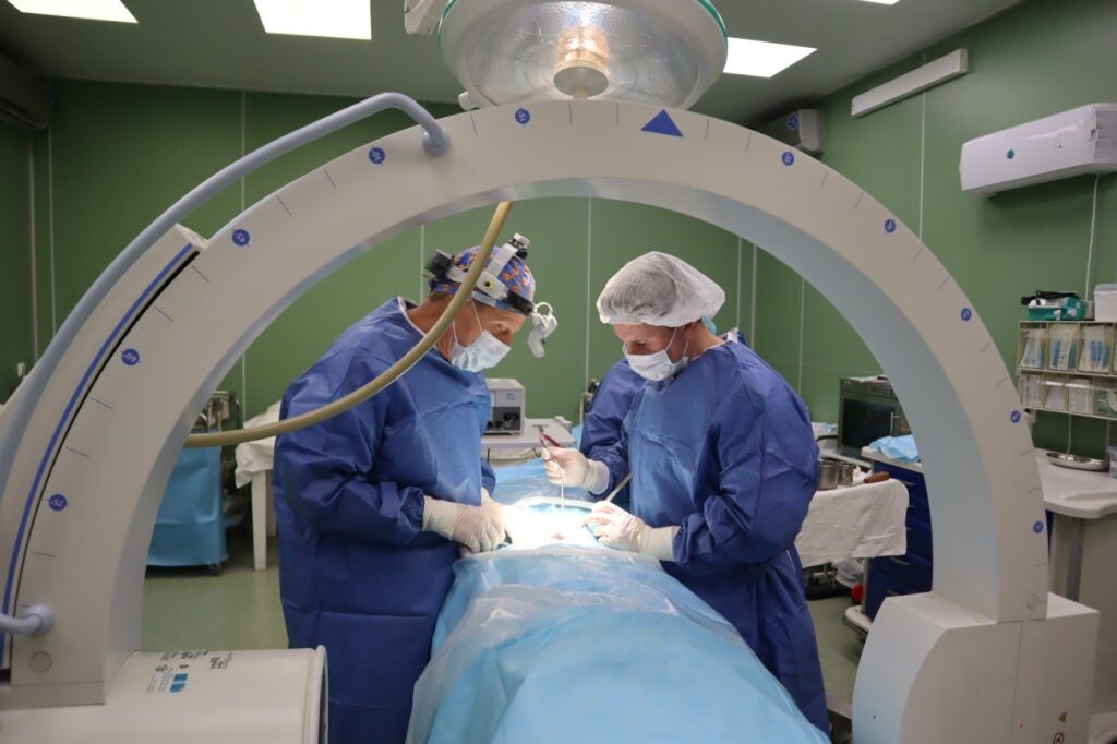 У пациента диагностировали нестабильность четвертого и пятого поясничных сегментов позвоночника. Рентгенконтролер через укол установил миниимпланты, блокирующие фасеточные суставы. Раньше такие операции проводили через два больших разреза вдоль позвоночника, а благодаря новой технологии процесс длится в три раза меньше и позволяет без повреждения тканей надежно зафиксировать страдающий сегмент. Так и реабилитация проходит быстрее.